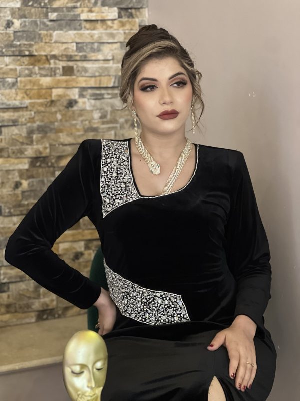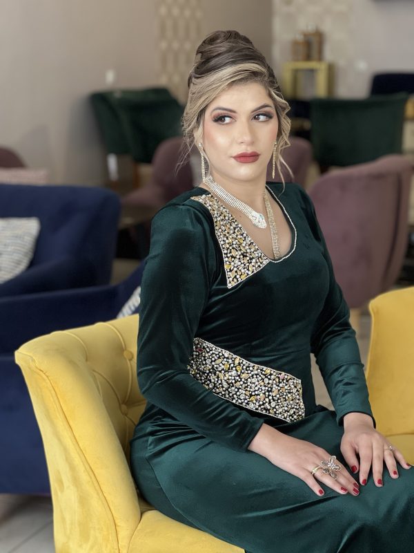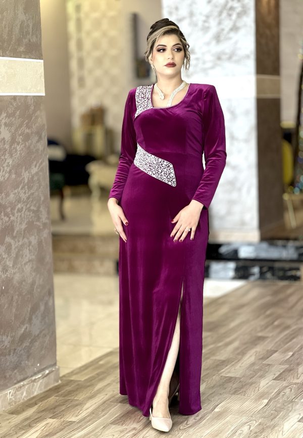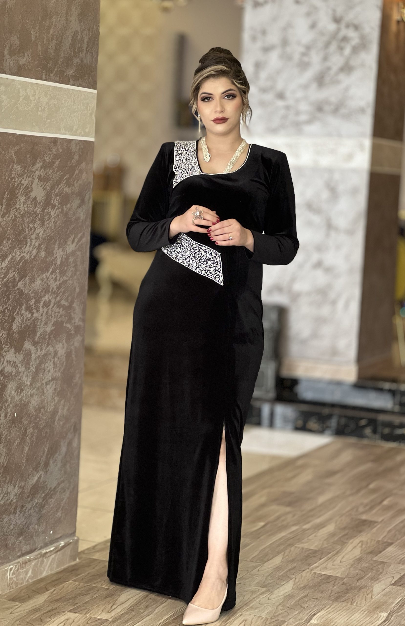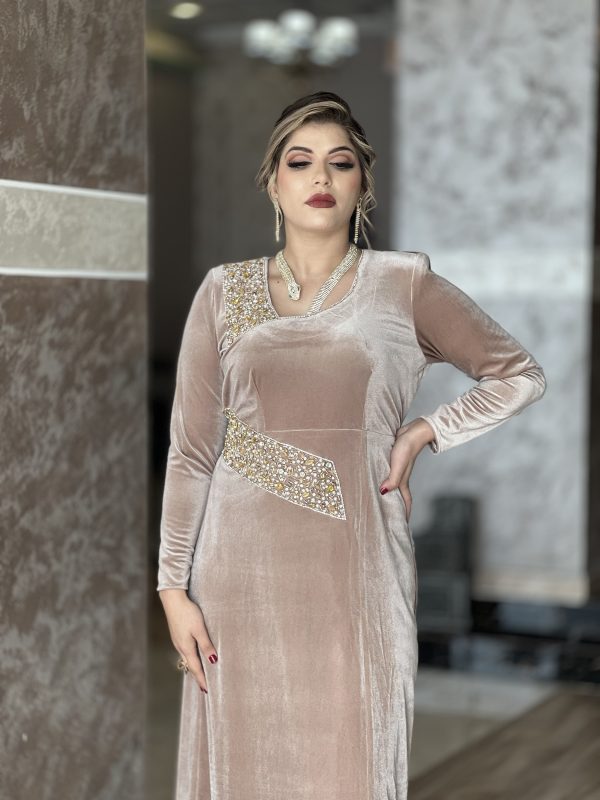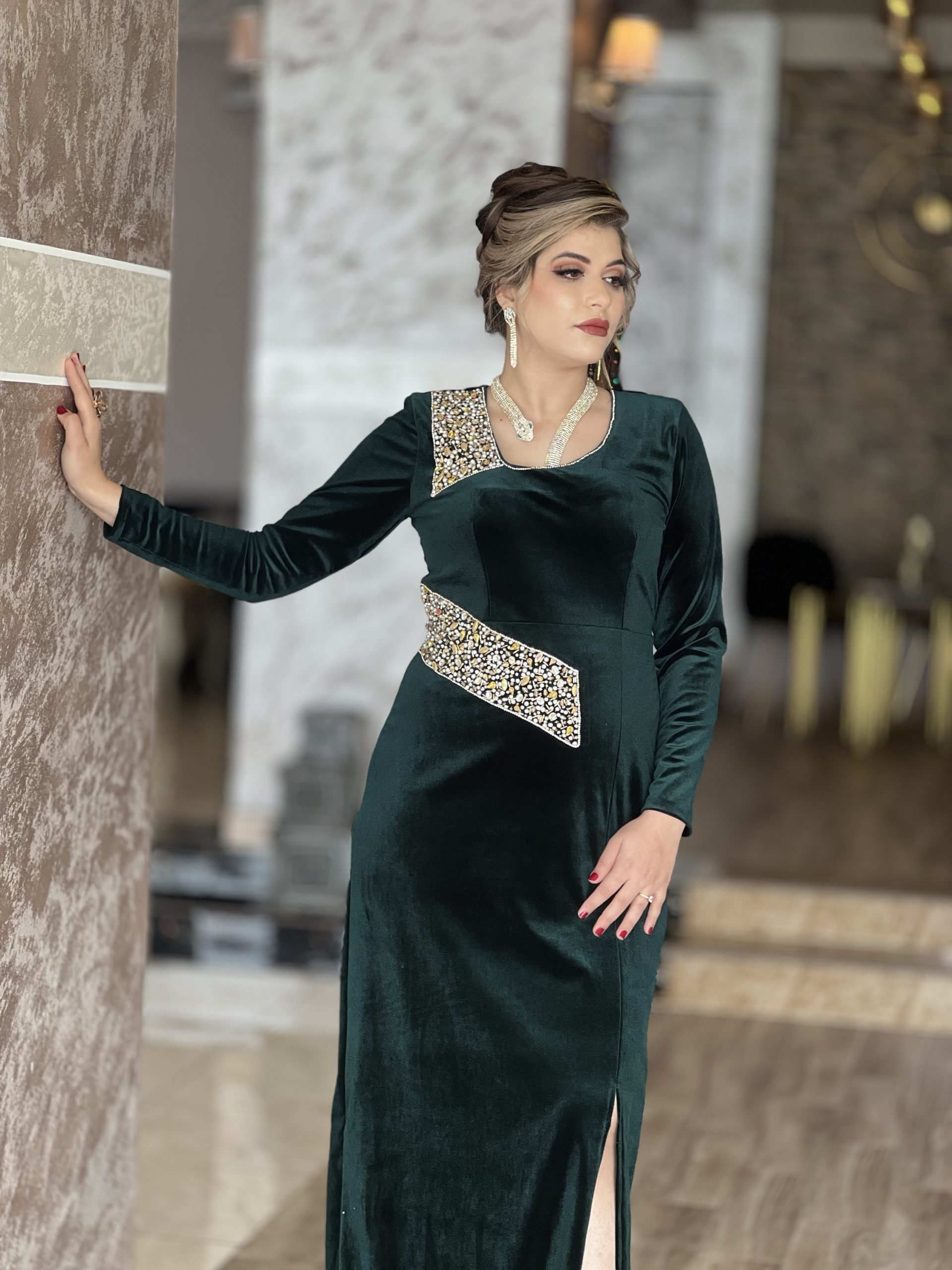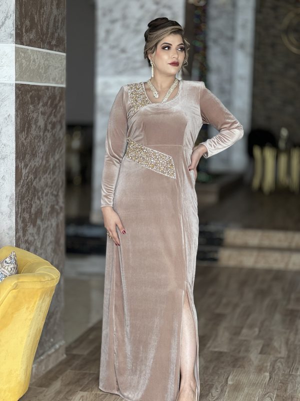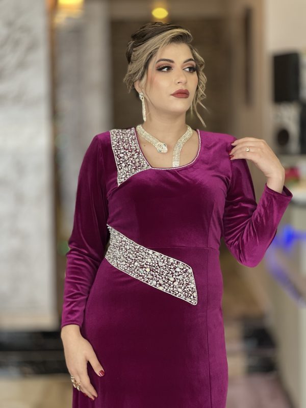 فستان مميز باحجار حرة مخاطة بالابرة والخيط بقماش القطيفة الملكية (royale)