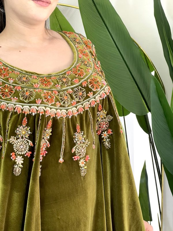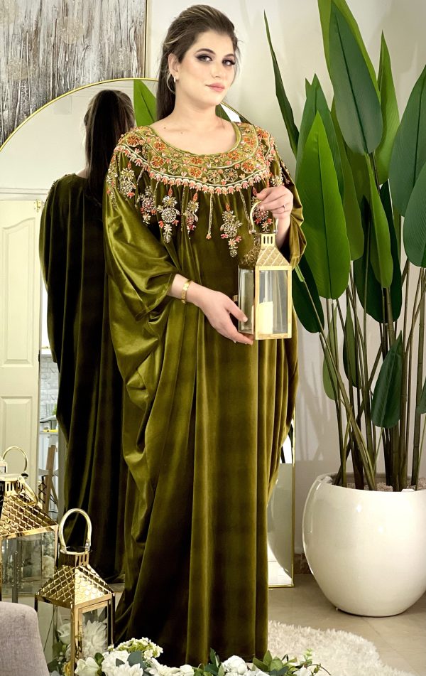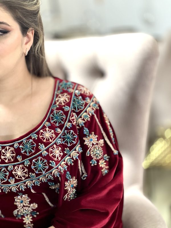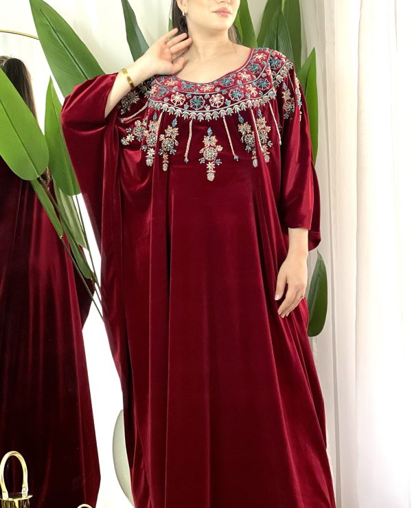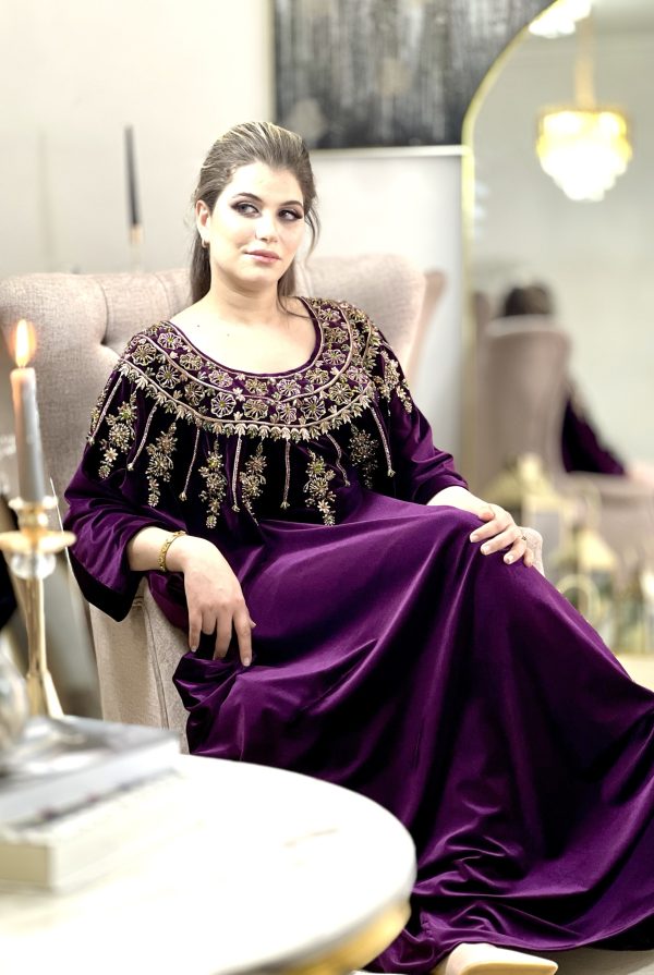 فستان مرصع بالحجارة الحرة الاصيلة التي لا تتغير مع الزمن ولا تصدأ بقماش القطيفة الفاخرة وتفصيلة ذات طابع خليج أنيق يضفي لمسة من الفخامة على اطلالتك يلائم كل الاجسام الرفيعة والممتلئة لتتميزي وحدك بتصميم عصري وفريد من نوعه